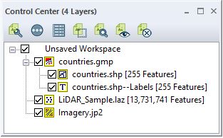 The Control Center (formerly the Overlay Control Center) serves as the central control for handling all loaded data sets (layers). Each data type is indicated by an icon next to the layer name. Layers can be selected and organized into groups that will then appear as an expandable list of layers in the control center.