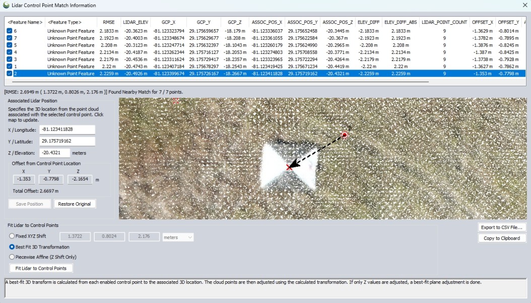 The data table displays a list of the input control points and offset values from corresponding location in the point cloud. The calculated statistics will not include lidar points that are hidden due to your lidar filter settings.