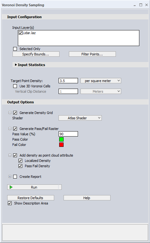 Localized Density - Applies the calculated density value to each point in the point cloud as an attribute. Creates the attribute Localized Density (M) = points per square meter, calculated from the Voronoi polygons. Use the Color by Localized Density (points/m^2 Lidar Draw Mode option to visualize this attribute