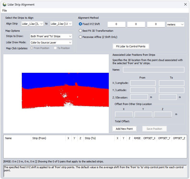 Use the Lidar Strip Alignment tool to easily adjust one lidar strip / flight line to match another through the manual placement of control points. This tool is similar to Lidar QC, but is tailored for aligning strips / flight lines.