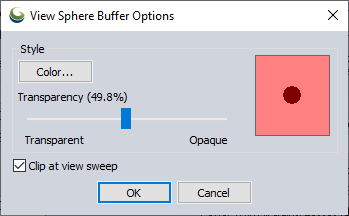 Generate View Sphere Buffer- This option creates a spherical mesh buffer feature centered on the transmitter location and clipped at the reference terrain. This feature will be rendered in 3D to view the extent of the viewshed area in the 3D Viewer. Click on the '...' button next to the checkbox option to open the View Sphere Buffer Options. Here, the color and transparency of the mesh feature can be set, and an option to Clip at view sweep will crop the 3D buffer to the start and swept angle specified in the Viewshed Setup. The color and transparency of the generated view sphere mesh can be edited later through the Modify Feature Info dialog.