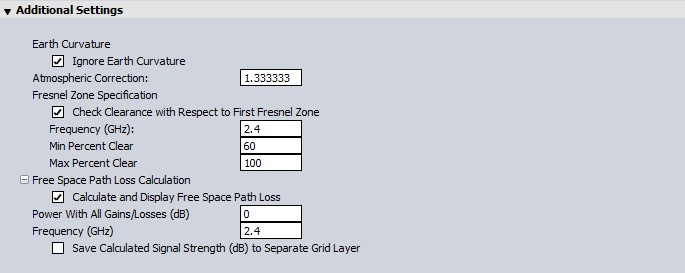 The Fresnel Zone Specification section allows you to have the viewshed analysis also check that a certain portion (the Min and Max Percent Clear values) of the first Fresnel zone for a transmission of a particular frequency is clear. The typical standard is that good visibility requires that at least 60% (the default) of the first Fresnel zone for the specified frequency be clear of obstructions. If you specify a maximum Fresnel zone percentage clear other than 100%, only those locations where the minimum percentage of the 1st Fresnel zone that is clear is between your specified percentages will be marked as visible.