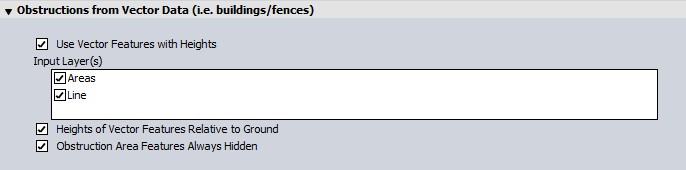 Heights of Vector Features Relative to Ground - enable this option when the elevation values stored with vector features are relative to the ground. Leave this option disabled to indicate that heights are relative to mean sea level. Typically heights for vector features are specified relative to the ground. If any area features are included and their heights are relative to the ground, the obstruction heights within those areas will be increased by the specified amount, but any receiver heights will still be based on the terrain. This makes things like wooded areas very easy to model.