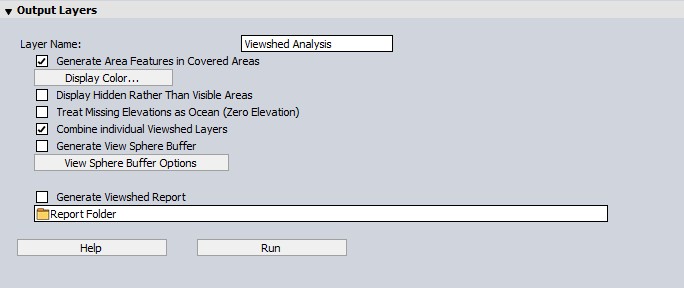 Combine Individual Viewshed Layers - When processing multiple viewsheds at one time, the Combine Individual Viewshed Layers option can be used to combine the individual Viewshed outputs into a single overlapping layer. Each viewshed feature retains its individual feature attributes. An additional TOWER_ID attribute is added to allow for the ability to select attributes (viewsheds) by tower points.