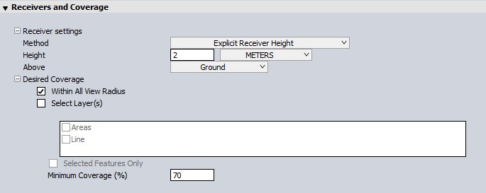The Receiver Elevation section allows you to specify the minimum height above the ground or sea level (absolute elevation in your vertical datum) from which the transmitter must be visible for the location to be considered visible. It is common to specify an elevation above ground, but specifying an elevation above Sea Level can be useful for aviation purposes.