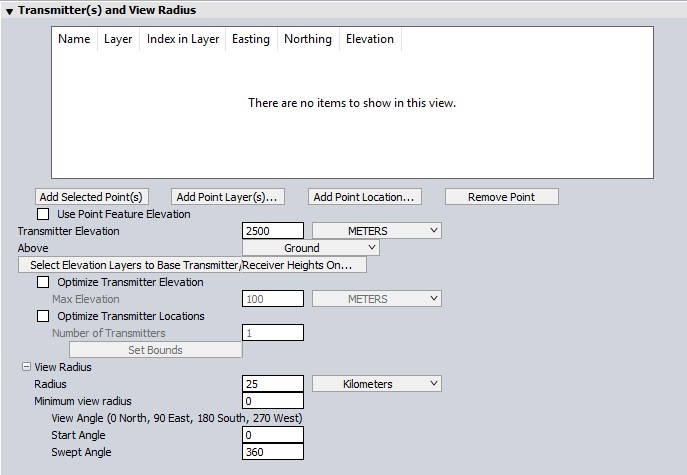 Transmitter locations can be added from existing point features in the workspace,manually clicked locations, or derived from using the Optimize Transmitter Location option.